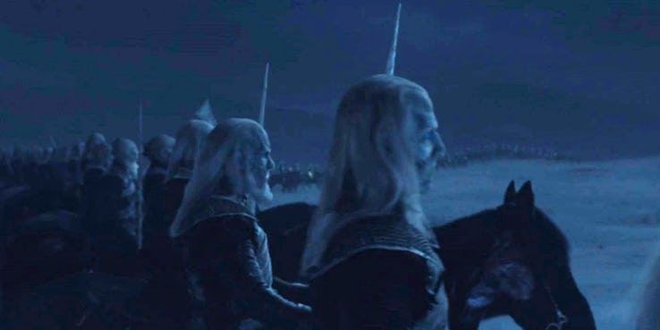 Gestützt wird diese Theorie nicht nur durch die Annahme, dass der blaue Bösewicht wahrscheinlich gar nicht mal so blöd ist und sich wohl eher nicht in die recht offensichtliche Falle locken lässt, sondern auch dadurch, dass er in den ersten zwei Folgen noch nicht zu sehen war. Bei ihrer Ankunft am Ende der Episode „Ein Ritter der Sieben Königslande“ wird die Armee der Untoten von mehreren Weißen Wanderern angeführt, aber vom Nachtkönig ist keine Spur.