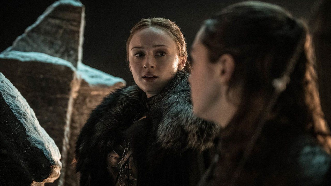 Auch Sansa Stark (Sophie Turner) und Arya (Maisie Williams) haben noch einen Moment für sich. Sansa schaut ihre Schwester traurig und sorgenvoll an, wahrscheinlich weil der Zeitpunkt des Abschieds gekommen ist – Sansa, die nicht kampferfahren ist, dürfte Schutz in der Krypta suchen. Arya hingegen wird ihre Ausbildung zur Assassinin einsetzen und kämpfen, für die Schlacht gegen die Armee des Nachtkönigs hat sie sich extra eine neue Waffe anfertigen lassen.