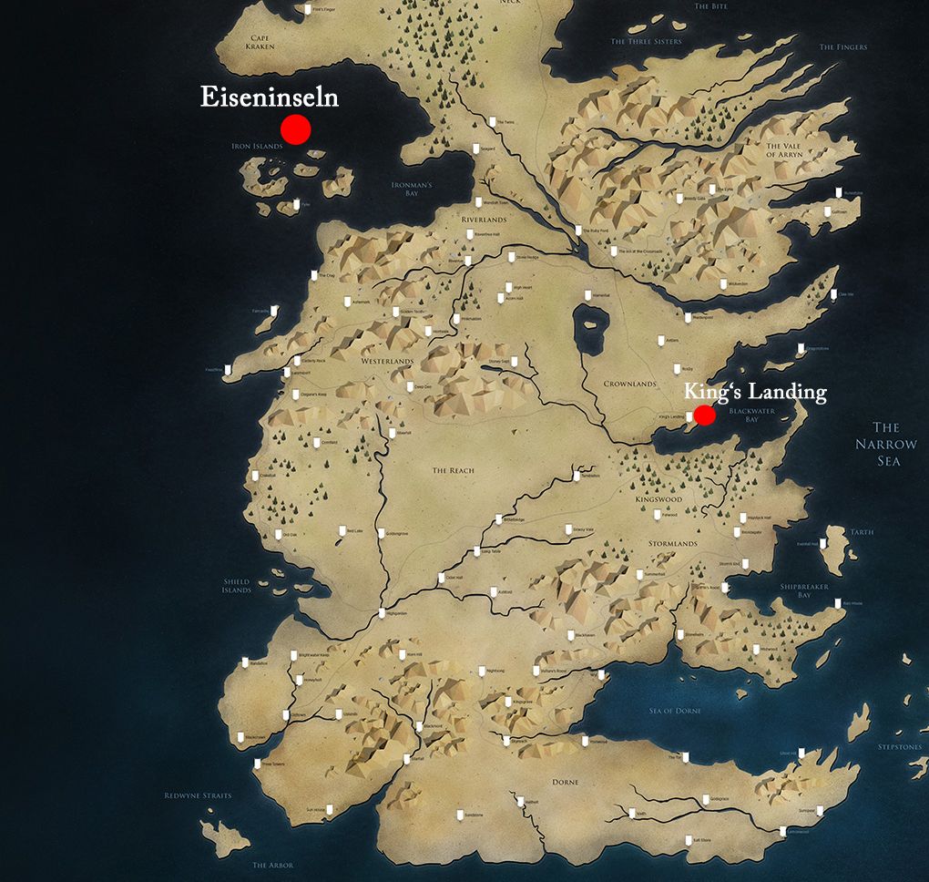 Bevor sie aber überhaupt zu den Eiseninseln gelangt, muss Arya aber noch einen weiten Weg zurücklegen und einmal um Westeros herumsegeln, wie ihr auf der folgenden Karte sehen könnt: