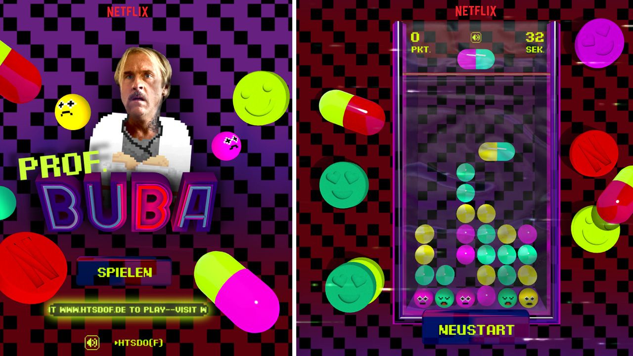 Wenn der jugendliche Moritz (Maximilian Mundt) und sein bester Kumpel Lenny (Danilo Kamperidis) in „How To Sell Drugs Online (Fast)“ auf die Idee kommen, einen Online-Drogenhandel aufzuziehen, wird passend zu den zwei Hauptfiguren auch immer wieder die Nerd-Kultur abgefeiert – sowohl inhaltlich auch auch bei der peppigen und rasanten Inszenierung. Doch mit der Serie selbst hört das nicht auf. Ganz im Geiste der Netflix-Serie wurde auch das kleine Online-Game „Prof. Buba“ entwickelt, das ihr sowohl im Desktop-Browser als auch mobil über Smartphone und Tablet unter htsdof.de spielen könnt.