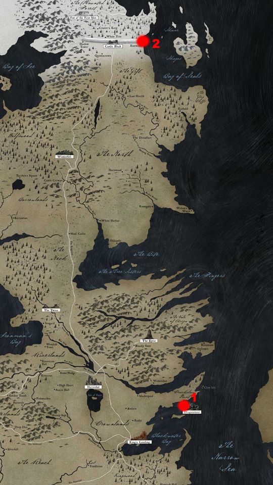 Anders sieht es hingegen bei Jon Snow (Kit Harington) aus. Der reist zwar nur eine einzige Strecke, dafür segelt er aber von Drachenstein (1) aus bis nach ganz in den Norden von Westeros zur Festung Ostwacht (2). Das sind etwa 4.000 Kilometer oder 17 Tage an Bord eines Schiffes – und das auch nur bei guten Bedingungen.