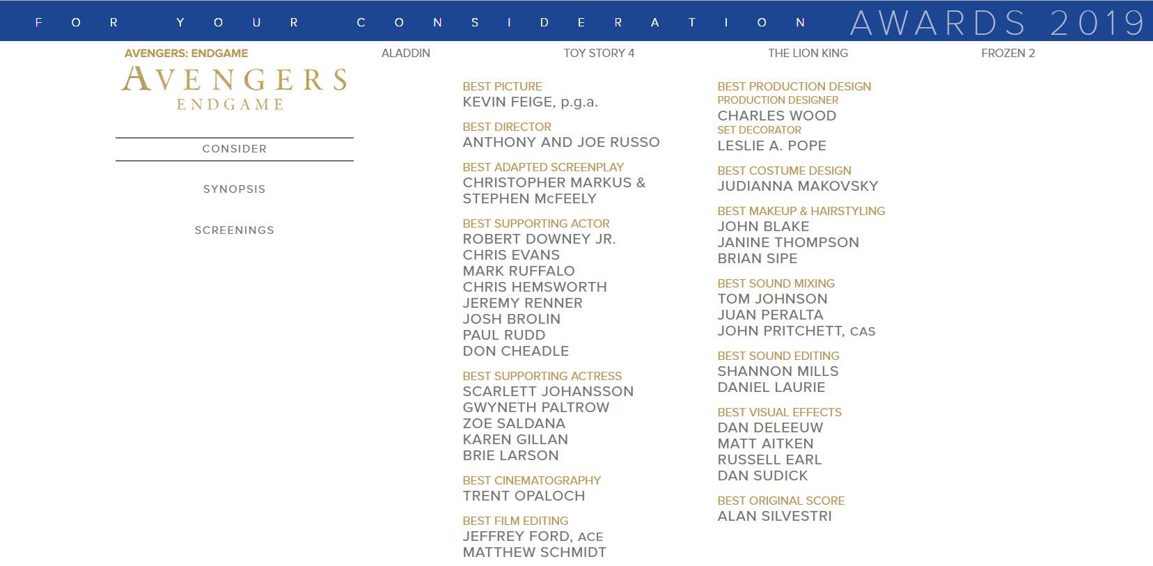 Wenn die Oscar-Saison ansteht, machen all die Studios Werbung für ihre Filme. Dazu gehören auch traditionell sogenannte „For Your Consideration“-Banner und -Webseiten. Als Disney seine FYC-Internetseite veröffentlichte, gab es bei den Marvel-Fans einen Aufschrei: Denn Disney machte Werbung für „Avengers: Endgame“ als Bester Film, für Regie, Drehbuch und zahlreiche technische Kategorien, aber nicht für die Darsteller – vor allem nicht für Robert Downey Jr.