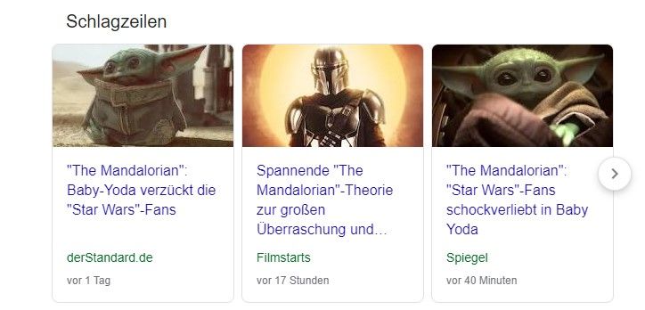 Weil also sehr viele Menschen nach [SPOILER] googeln, schreiben viele Medien [SPOILER] direkt in die Überschrift und packen gleich noch ein Bild dazu. Diese Artikel allerdings werden auch Nutzern angezeigt, die einfach nur „Mandalorian“ in die Suchmaske eingeben (in den sozialen Netzwerken kursieren außerdem zahlreiche Memes).