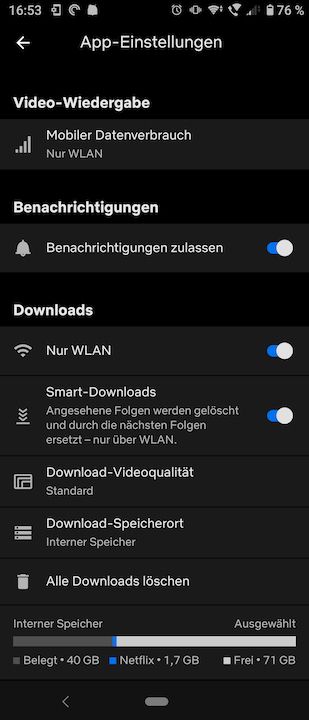 Bei „Mobiler Datenverbrauch“ könnt ihr auswählen zwischen „Nur WLAN“, „Daten sparen“ und „Maximaler Datenverbrauch“ (bei „Daten sparen“ sieht das Bild immer noch absolut sauber aus). Wenn ihr übrigens auch noch Platz sparen wollt auf eurem Handy, wählt bei „Download-Videoqualität“ lieber „Standard“ als „Hoch“.