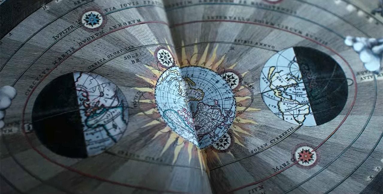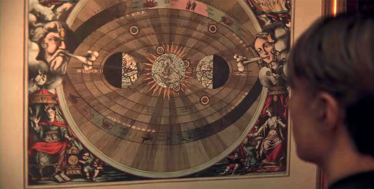 - Staffel 2, Folge 1: Nach etwa 38 Minuten gibt es eine Szene, in der die junge Elisabeth (Carlotta von Falkenhayn) die Bücher im alten Haus von H.G. Tannhaus durchstöbert. Dabei stößt sie auch auf eine vielsagende Abbildung, die im Grunde schon hier das große Gesamtkonzept der Serie vorwegnimmt. Darauf ist in der Mitte eine hell strahlende Weltkugel zu sehen, die links und rechts von zwei, jeweils halb von ihr erleuchteten Welten gesäumt ist. Am linken und rechten Rand des Bildes sind zudem zwei gottgleiche Gestalten zu sehen, die offenbar auf die beiden von der mittleren Welt abhängigen Kugeln einwirken, was womöglich symbolhaft die manipulativen Einflüsse von Adam (Dietrich Hollinderbäumer) und Eva (Barbara Nüsse) in ihren jeweiligen Welten darstellt.