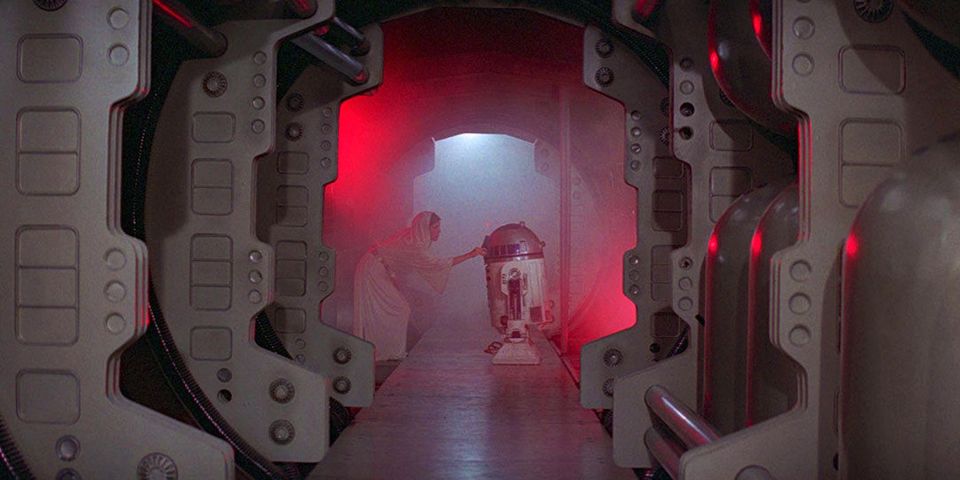 Die anderen wichtigen Figuren etabliert Lucas ebenfalls in prägnanten Einstellungen: Leia (Carrie Fisher), eine Frau der Tat, versteckt die Todessternpläne in einem Roboter und sieht dabei bedrohlich zwischen zwei Wänden eingekeilt trotzdem entschieden aus: