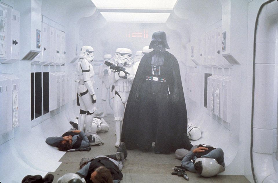 Damit ist das Wichtigste bereits nach gut zweieinhalb Minuten Film klar, obwohl wir ohne umfangreiche Exposition in die Handlung geschmissen wurden und niemand auch nur ein Wort gesprochen hat. Es ist klar: Die Guten sind am Arsch! Dann zieht Lucas die Spannungsschraube sofort weiter an, wenn die Rebellensoldaten an Bord des unterlegenen Kreuzers vor einer Tür in Stellung gehen, die bald darauf explodiert. Gepanzerte Soldaten in fiesen, an Fratzen erinnernden Helmen strömen durch die Tür und die Guten ergreifen die Flucht. Auftritt Darth Vader!