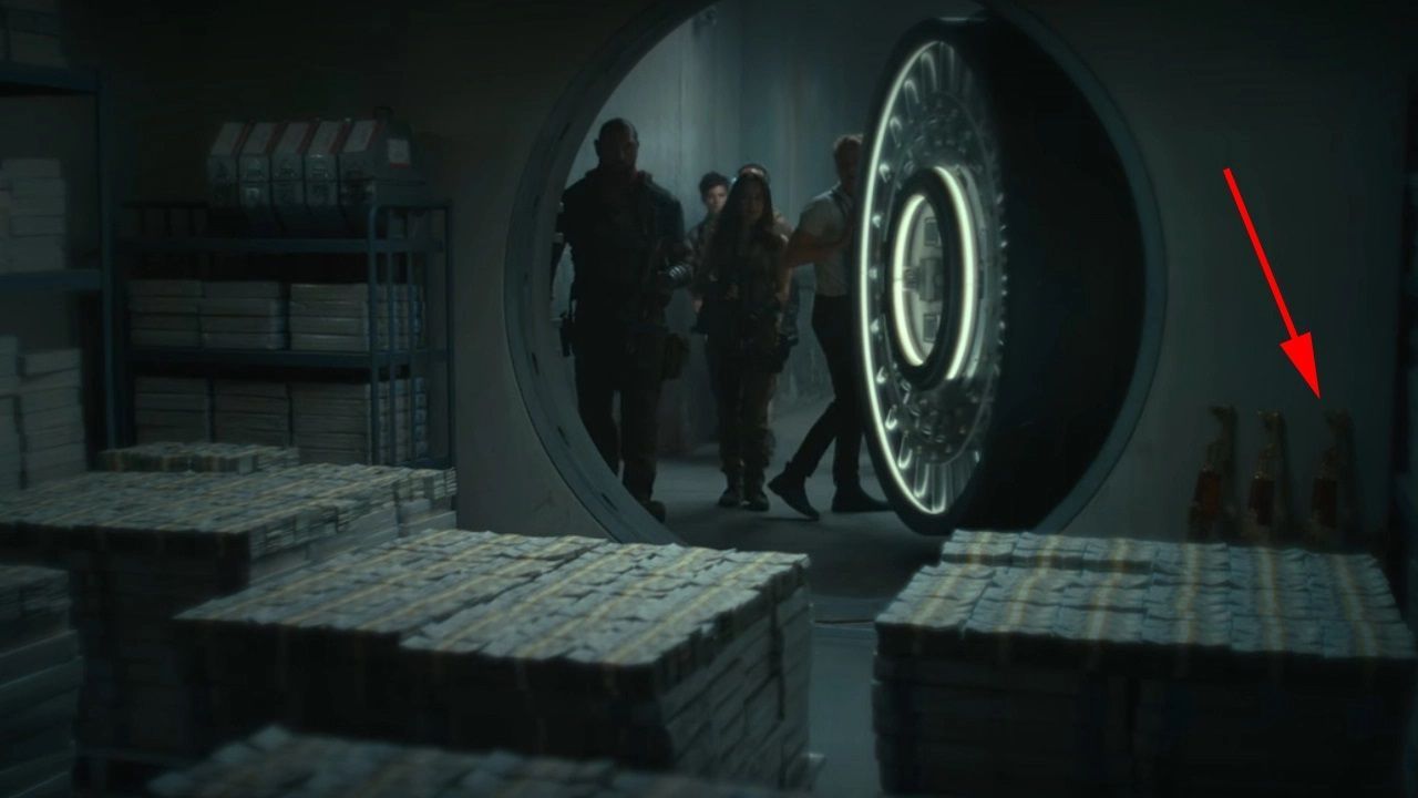 Und schon viel früher im Film gibt es eine Anspielung auf die Zeitschleifen. Wenn bei der Planung des Coups Dieter den Safe öffnet, sehen wir rechts im Tresor drei Gewehre stehen, die genauso aussehen wie das Gewehr, das Guz benutzt. Eine mögliche Anspielung darauf, dass sie es bei bislang drei Anläufen bis hinein in den Safe geschafft haben, wo dann jedes Mal eines der Gewehre stehengelassen wurde. Interessant ist allerdings: Wenn sie es dann wirklich bis in den Safe hinein schaffen, ist von den drei Gewehren plötzlich nichts mehr zu sehen.