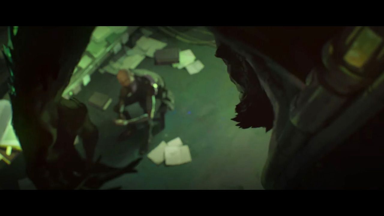 In Episode 9 gibt es nämlich einen kurzen Moment, in dem wir Singed sehen, wie er trauert. Er sieht sich dabei ein Bild an, dass vermutlich seine Tochter zeigt („LoL“-Fans spekulieren, dass es sich dabei um die Figur Orianna handeln könnte). Die Kamera zoomt heraus und nach einem Schnitt sehen wir die schemenhaften Umrisse einer Figur, die sehr stark nach Warwick aussieht: