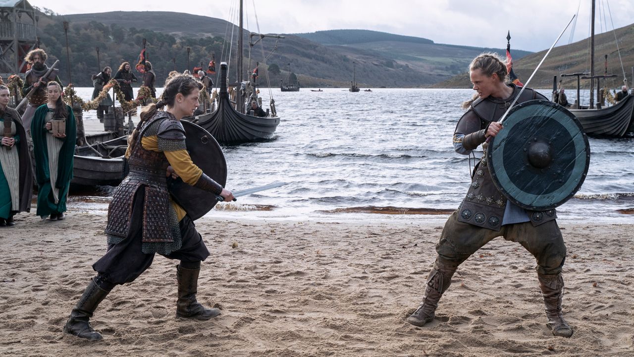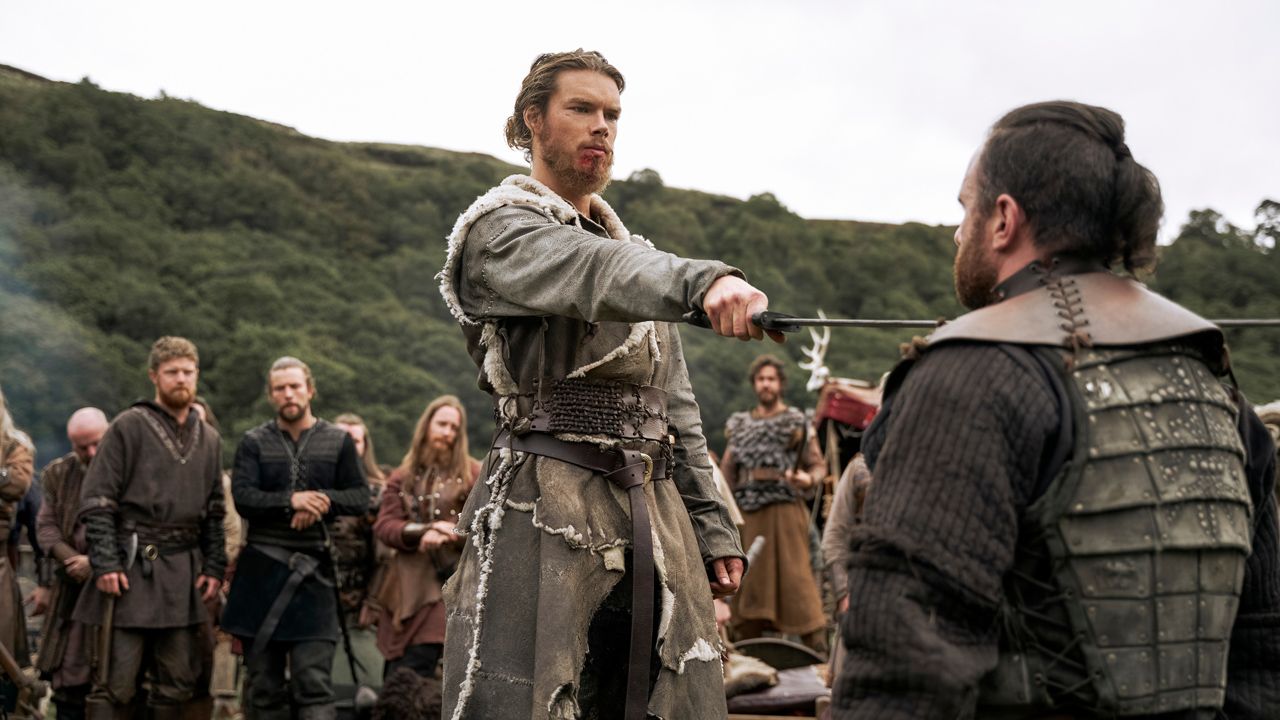 Selbst wenn es im Netflix-Hit „Vikings: Valhalla“ Szenen wie die große Schlacht auf der Brücke nach London gibt, konzentriert sich die Kamera fast immer schnell auf einzelne Kontrahenten. Und meist dominieren ohnehin die Kämpfe einzelner Krieger und Kriegerinnen, wie schon die erste Episode zeigt, als Grönländer Leif (Sam Corlett) direkt nach seiner Ankunft im Wikinger-Camp herausgefordert wird.