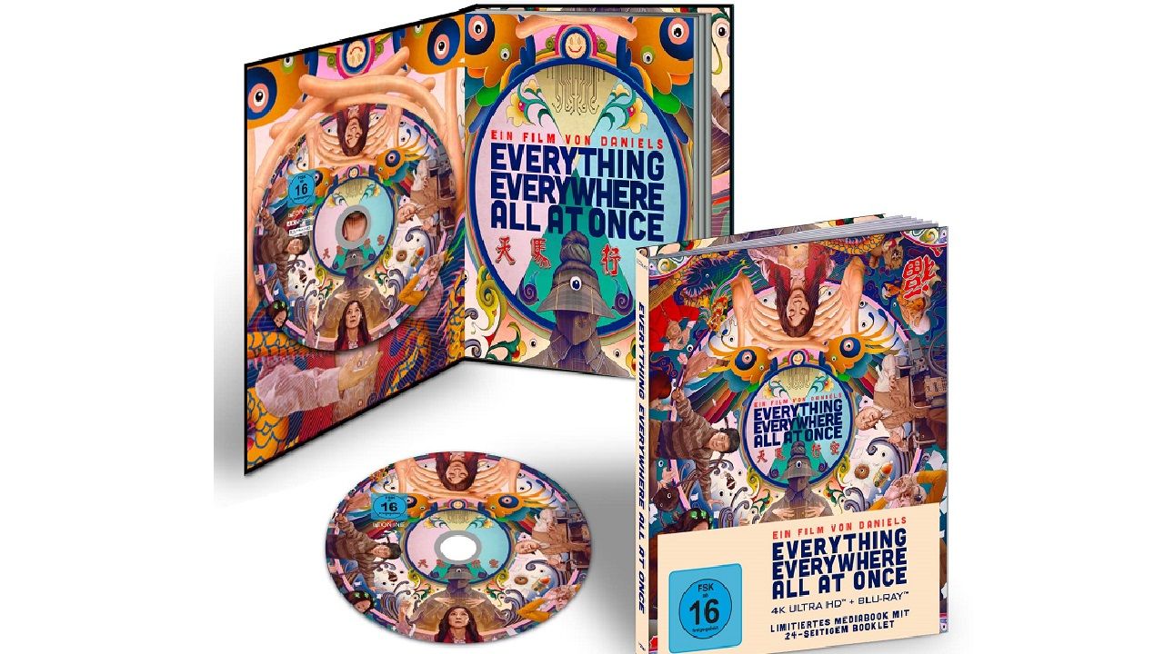 Das Mediabook enthält „Everything Everywhere All At Once“ sowohl auf 4K-Disc als auch auf Standard-Blu-ray. Während die 4K-Disc ohne Bonusmaterial daherkommt, befinden sich auf der Blu-ray-Disc zahlreiche Extras, die Einblicke hinter die Kulissen dieses außergewöhnlichen Projekts voller verrückter Effekte gewähren. Weitere Informationen gibt es im 24-seitigen Booklet des Mediabooks, das obendrein mit seinem Coverdesign kongenial das Feeling von „Everything Everywhere All At Once“ einfängt.