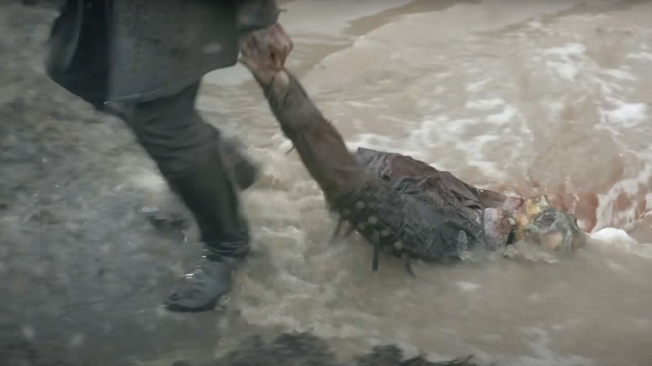 Doch viel deutlicher als in Folge 3 kann man das Ableben einer Figur eigentlich kaum zeigen. Zwischen Blutbad und Drachenfeuer geht womöglich etwas unter, dass der Krabbenspeiser sich vom Schlachtfeld zurückzieht und Daemon Targaryen (Matt Smith) ihm hinterhereilt, doch in der folgenden Szene gibt es wenig Interpretationsspielraum: Daemon kommt wieder aus der Höhle, in die Craghas geflohen ist, und schleift dabei dessen abgetrennten Oberkörper hinter sich her.