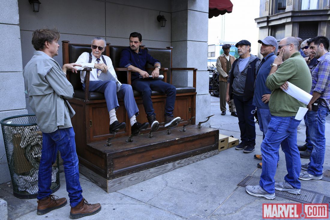Trotz seiner mittlerweile 92 Jahre lässt es sich Marvel-Mastermind Stan Lee – seines Zeichens Miterfinder solch ikonischer Comic-Figuren wie Spider-Man, Hulk, Iron Man und Thor – nicht nehmen, auch in der aktuellen Marvel-TV-Produktion "Agent Carter" einen kurzen Gastauftritt zu absolvieren. Bereits im Dezember 2014 haben wir darüber berichtet, dass Lee in der vierten Episode, die den Titel "The Blitzkrieg Button" trägt und am 27. Januar 2015 auf dem US-Sender ABC ausgestrahlt wird, der Serie einen Besuch abstatten wird. Die obigen Bilder, die von Marvel.com veröffentlicht wurden, liefern nun einen ersten Eindruck von dem Cameo-Auftritt, bei dem Lee eine kurze Begegnung mit dem von Dominic Cooper verkörperten Howard Stark haben wird.