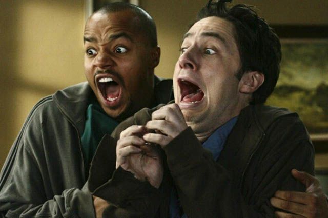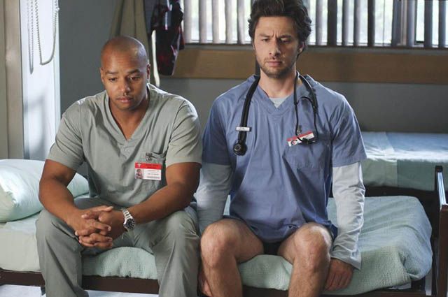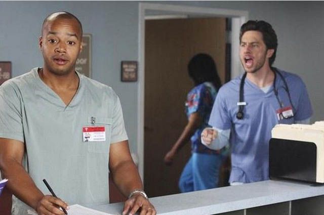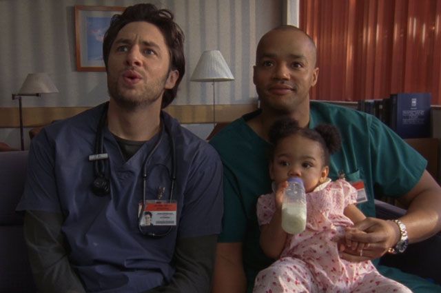 Turk: "Aw, dammit, I gotta go have ovulation sex again." J.D.: "Are you actually complaining about getting to have sex? Because that is so insensitive, Turk!" Turk: "J.D.!" J.D.: "Let me feel my feelings, Turk! We worked on this!"