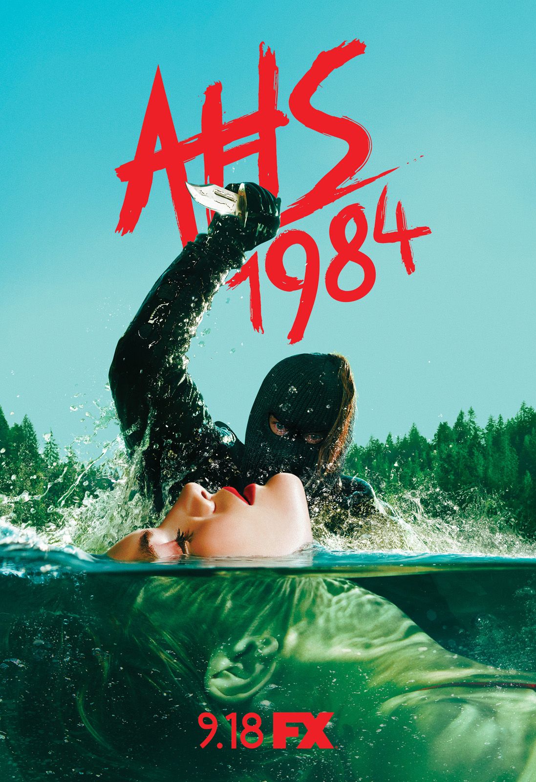 Insbesondere die breite Auswahl an Postern, die in den vergangenen Wochen stetig angewachsen ist, versprüht jede Menge Retro-Horror-Flair, wenn dort in kunterbunten Farben ein maskierter Serienkiller Jagd auf leicht bekleidete Damen inmitten trügerischer Ferienlager-Idylle macht. In der neunten „AHS“-Staffel selbst geht es dann nämlich tatsächlich in ein Sommercamp, in dem die jungen Betreuer nach und nach offenbar einem entflohenen Psychiatriepatienten zum Opfer fallen.